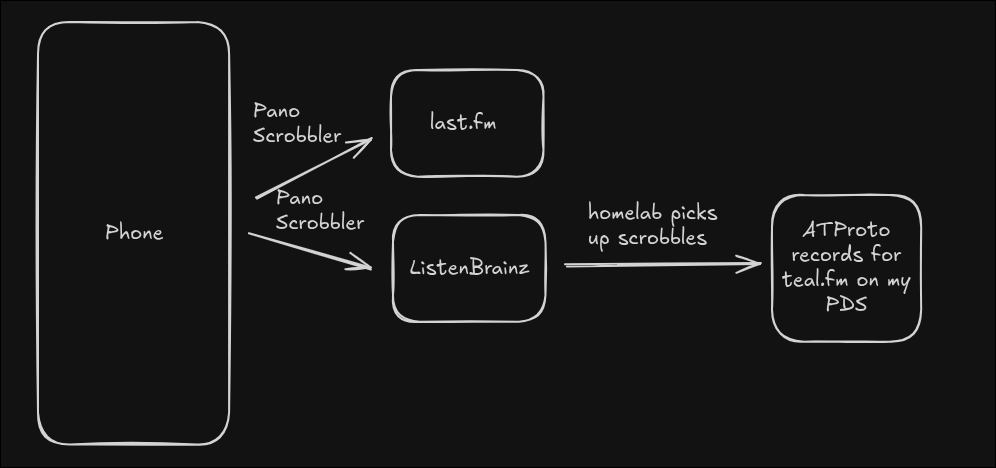 I've been scrobbling my listens for a few years now. First on last.fm, then ListenBrainz, and now teal.fm! To do this, I use Pano Scrobbler on my phone and https://github.com/foxxmd/multi-scrobbler on my homelab.